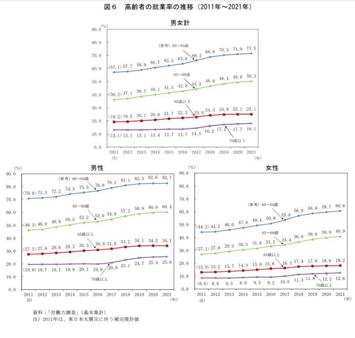 男女別の就業率を見ると、2021年は70歳以上の男性の25.6%が、女性は12.6%。
