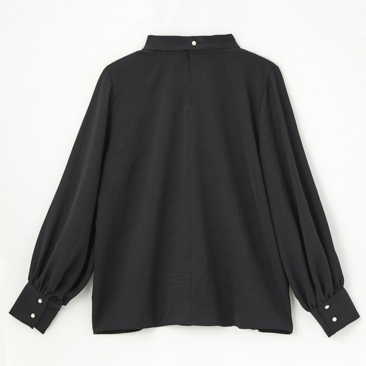 リボンを外すと、シンプルなハイネックブラウスに変化します。ジャンパースカートのインナーとしてもかわいく活用できそうな便利なアイテムです。