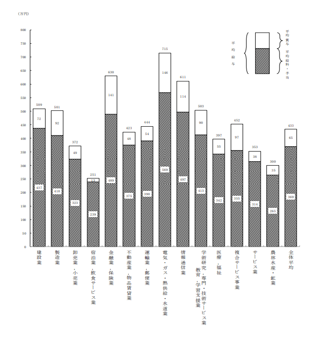国税庁の「令和2年(2020年)分民間給与実態統計調査」によると、「金融業・保険業」の平均給与は630万円でした。この金額は、全業種の中で2番目に高くなっています。なお、最高は「電気・ガス・熱供給・水道業」の715万円となりました。
