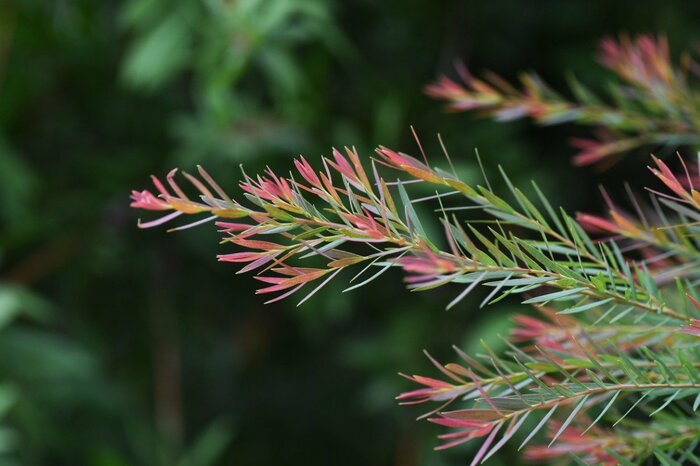 まるで羽毛のような花を咲かせる、メルヘンチックなメラレウカ。別名・ティーツリーとも呼ばれる常緑樹で、葉からは柑橘系の香りが楽しめます。