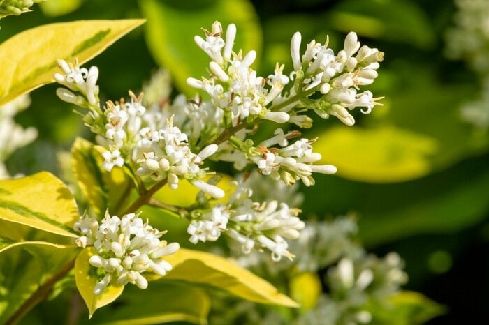 青みがかった葉に白い斑が入るシルバープリペットや、明るい葉色のレモンライム、緑の葉にクリーム色の斑が入るオーレアなど複数の品種があり、いずれも花から甘い香りが楽しめます。