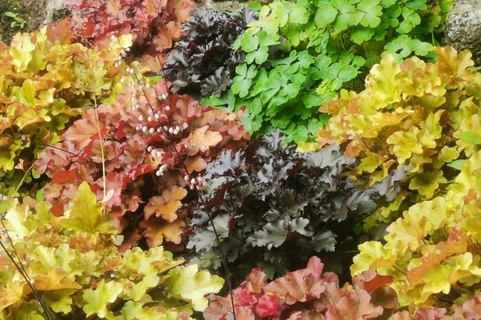 おしゃれな庭には欠かせない宿根草ヒューケラ。これから11月にかけての葉色は特に美しく、庭や花壇の雰囲気を明るくしてくれます。