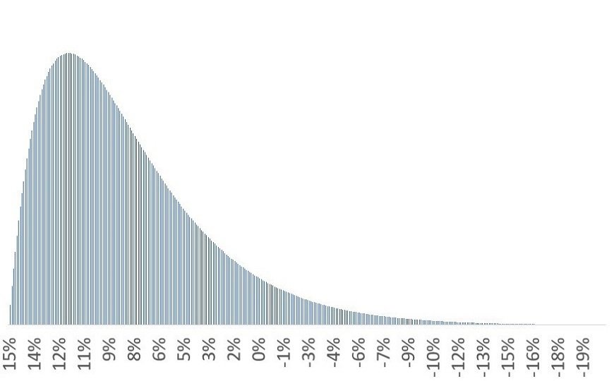ソーシャルレンディングは借り手の倒産リスクを取ることで国債等より高い金利を得る投資ですが、そのパフォーマンスは融資先が十分に分散されている場合、以下のような分布をするといわれています。