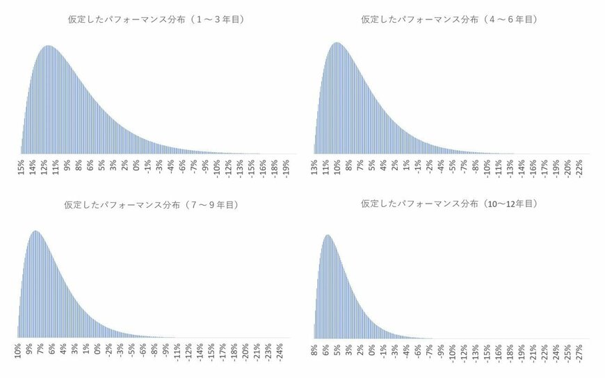 同じ資産に複利、単利で投資を行った場合の資産の増減の差異を見るために、以下のようなパフォーマンス分布を仮定して15年程度のパフォーマンスのシミュレーションを行います。