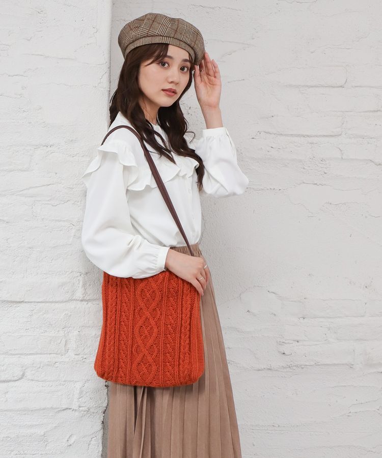 こちらがハニーズの公式Twitterでも話題になっている「ケーブル編ニットトート」です。ぬくもりを感じられるケーブル編みが、秋や冬らしくて、ほっこりとかわいいアイテムです。