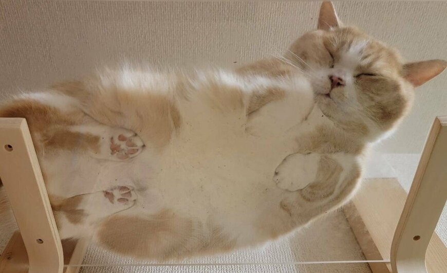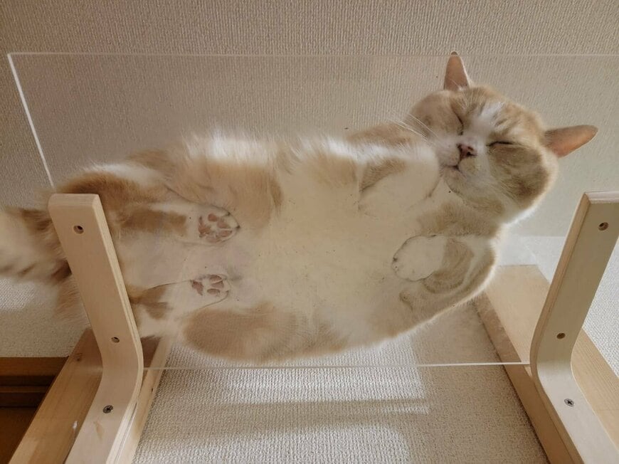 猫ちゃんのモッチリとした肉球や、お行儀よく揃えた両手が丸見えに……!つい見入ってしまう、眼福な光景です。