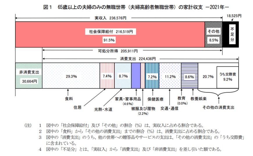 総務省統計局の「家計調査報告 家計収支編 2021年(令和3年)平均結果の概要」によると、65歳以上かつ無職の夫婦世帯における、ひと月の支出の平均額は25万5100円です。