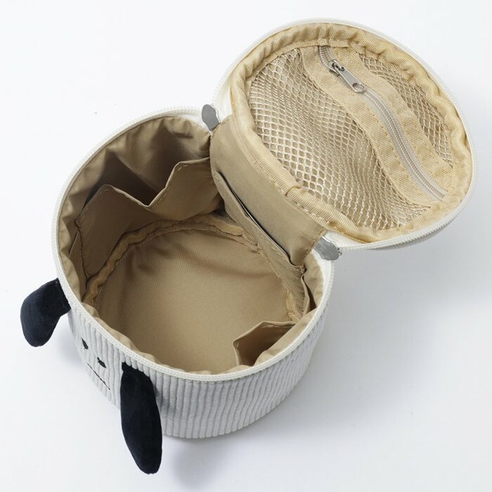 立体耳がかわいい筒形ポーチです。内側には整理収納がしやすいポケットなどもあるので、メイク道具や小物入れに最適です。