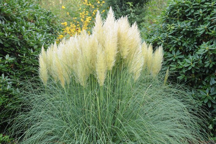 フワフワした大きな穂にインパクトがあるパンパスグラス。南アメリカやニュージーランドの草原に自生しています。背丈が高く秋空に白い穂がよく映えて、庭の主役として存在感を放ちます。