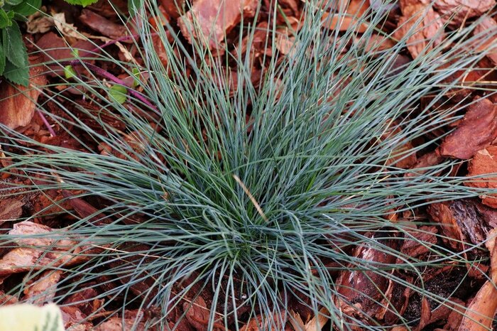 フェスツカ・グラウカは青みがかったシルバーリーフが特徴。針のように細い葉がフンワリと広がり、独特な葉色と草姿が印象的です。背丈が低めなので花壇の手前に植えるのがオススメ。