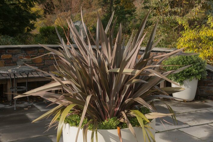 長く美しい葉が印象的なニューサイラン。秋にぴったりのカラーは濃い赤紫の葉色。扇型に広がる葉は寄せ植えのアクセントにもオススメです。