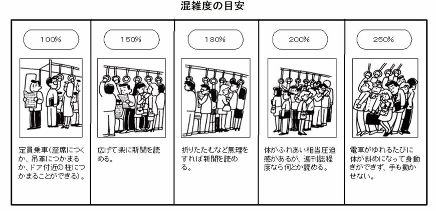 混雑度200%は「体がふれあい相当圧迫感があるが、週刊誌程度なら何とか読める」というレベルだとされているが、実際には「電車がゆれるたびに体が斜めになって身動きができず、手も動かせない」というレベルである250%を体感している人のほうが多いのではないだろうか。