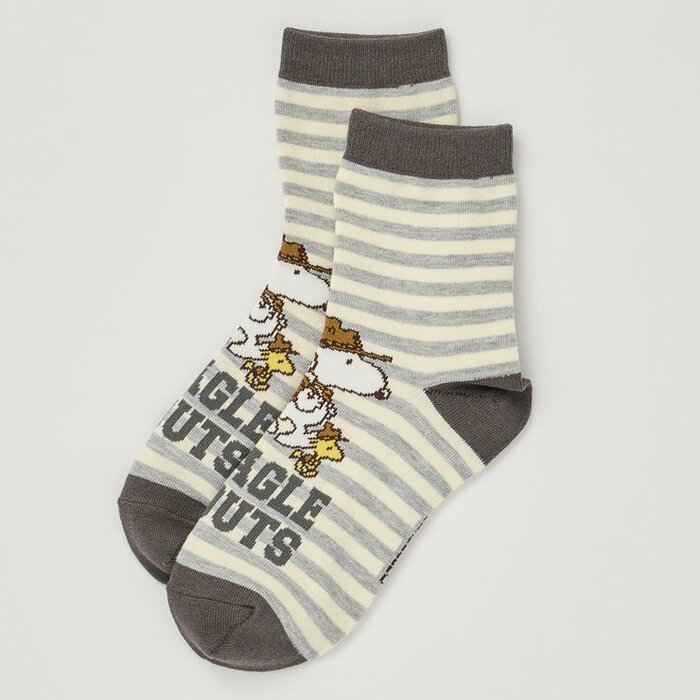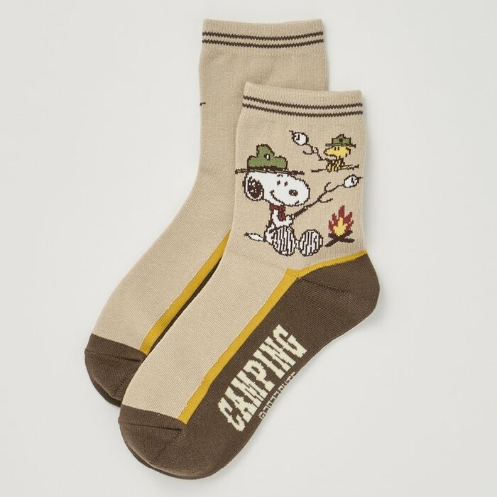 これからの季節にピッタリのPEANUTSキャンプシリーズです。キャンプに向かうスヌーピーをアイコンにした楽しむアウトドアをテーマにした、ベーシックなデザインのクルーソックスです。