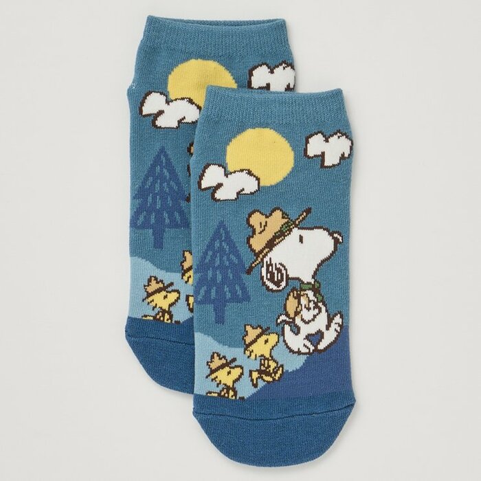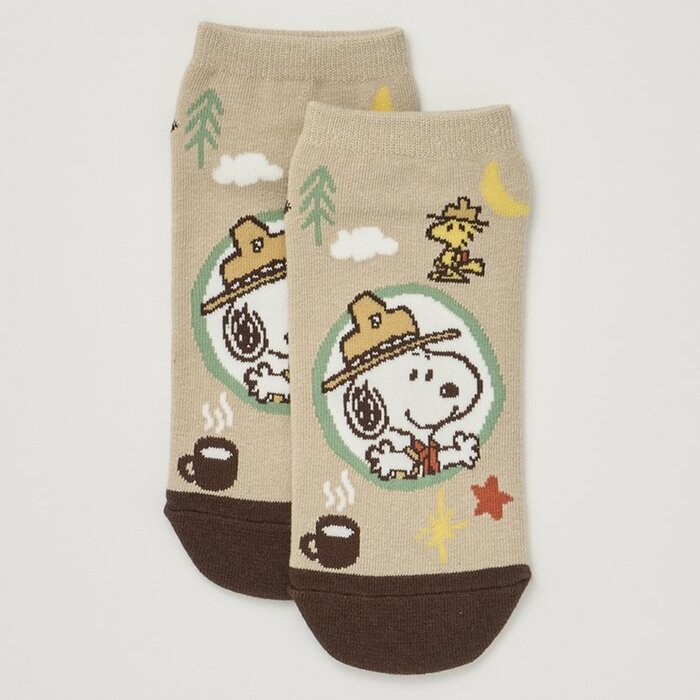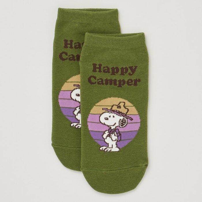 これからの季節にピッタリのPEANUTSキャンプシリーズです。キャンプに向かうスヌーピーをアイコンにした楽しむアウトドアをテーマにした、ベーシックなデザインのショート丈のソックスです。