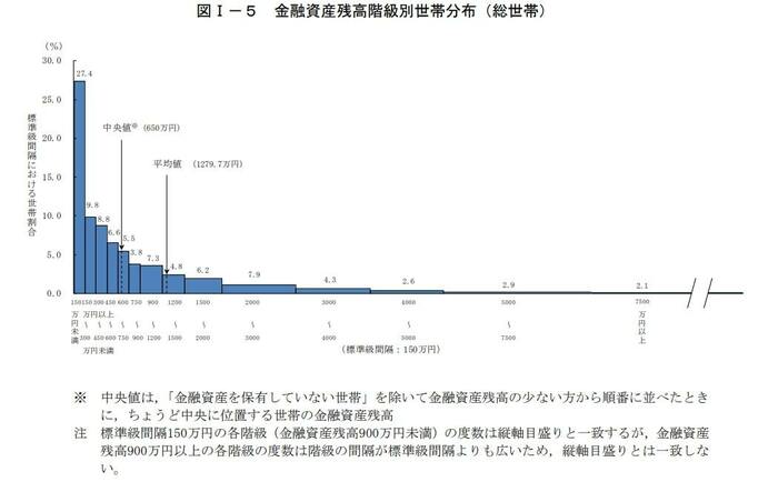 なお、本調査の総世帯の金融資産残高をみると、平均は1279万7000円ですが、より実態に近い中央値は650万円となっており、世帯分布は金融資産残高が少ない層に偏っています。