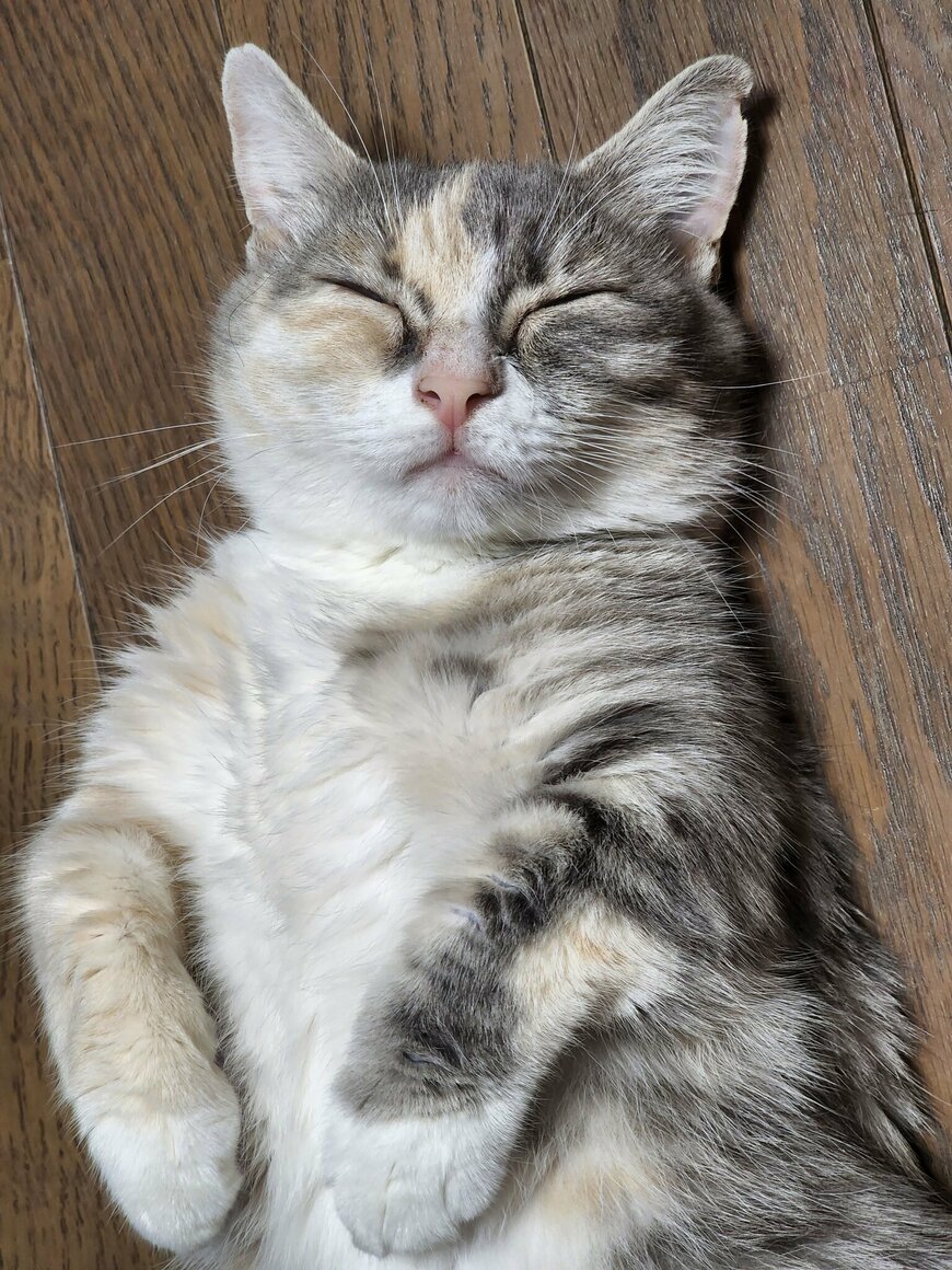 写真には、大胆にお腹を見せながらスヤスヤと眠る、かわいらしい猫が写っています。