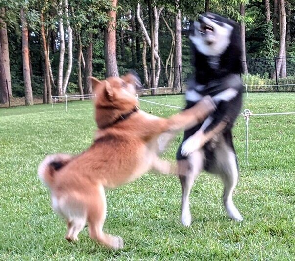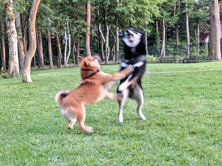 写真には、2匹のワンちゃんが元気いっぱいに遊ぶようすが写っていました。