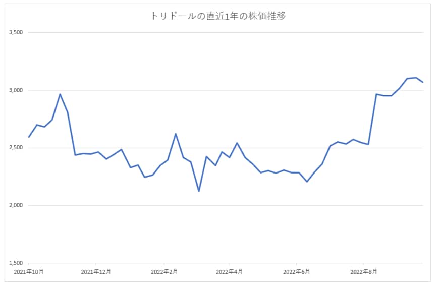 トリドールHDの株価は2021年11月の3050円が上場来高値となっていました。