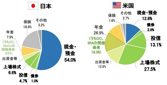 「現金・預金」の割合が全体の54%の日本に対し、米国は12.8%となっています。「上場株式・投信・債券」の割合は日本が12.8%、米国は61.5%です。