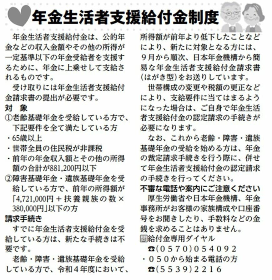 同じく東京都中央区の広報誌では、年金収入などが一定以下の方への支援も記載されています。