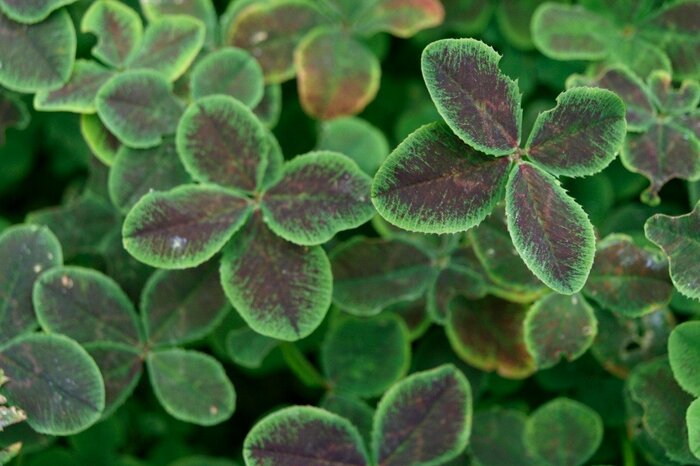 ブラッククローバーは褐色の葉を縁取るグリーンが印象的。ラッキーアイテムとされる四葉も多く、庭のアクセントとして人目を引きます。ほふくして広がるのでグランドカバーに最適。