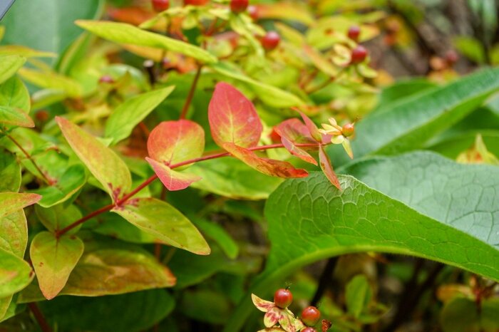 半日陰ではライムグリーンの葉が、日なたでは黄色に変化するヒペリカム。冬になるとオレンジに色付き、日当たりや気温でさまざまな葉色が楽しめます。