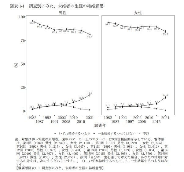 国立社会保障・人口問題研究所「第16回出生動向基本調査(結婚と出産に関する全国調査)」によれば、18~34歳の未婚者で「一生結婚するつもりはない」と答えた男性は 17.3%、女性は14.6%と、過去最高になりました。