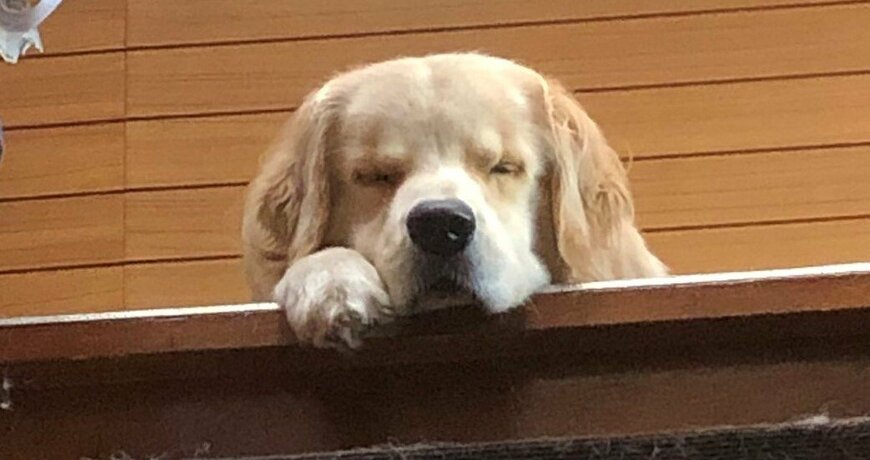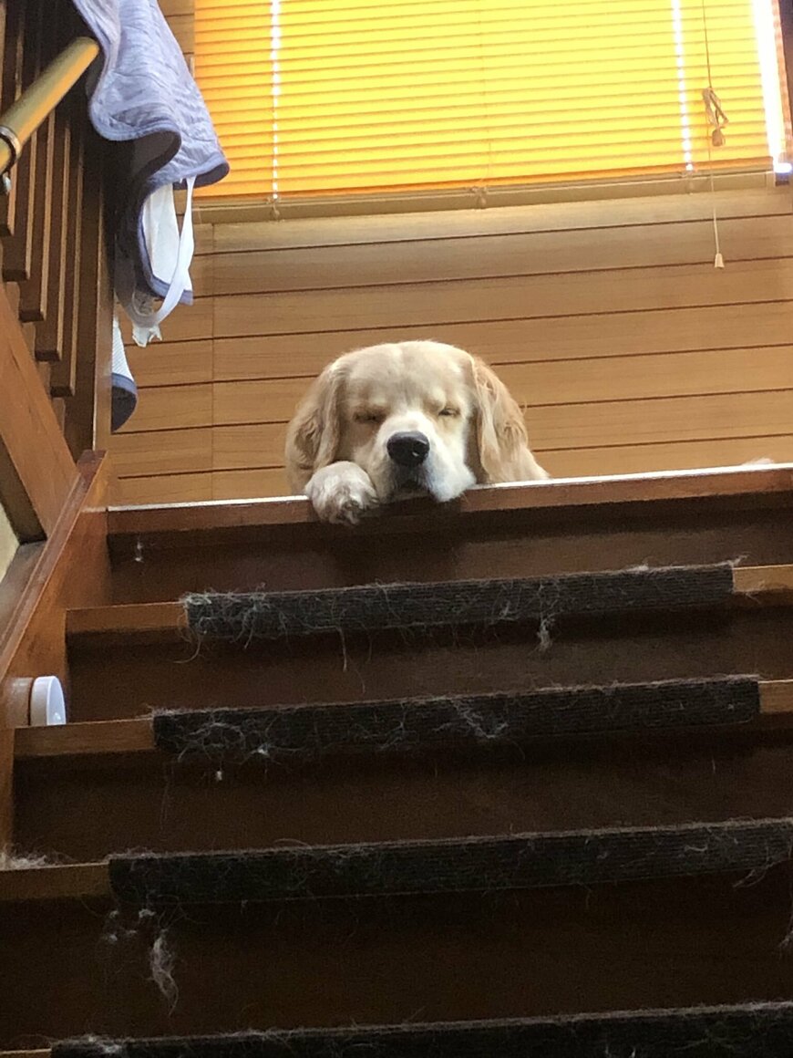 投稿された写真には、階段の最上段から顔を出す、1匹のゴールデンレトリバーが写っています。