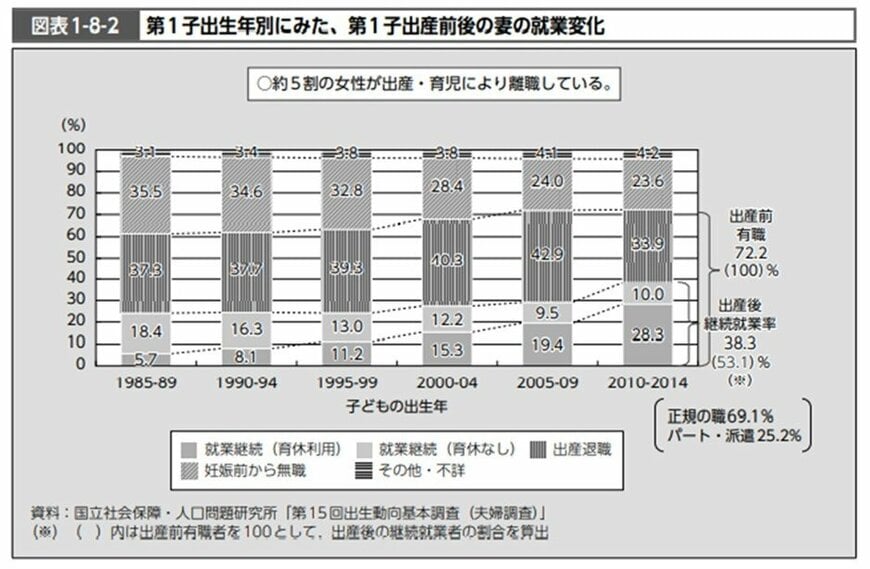 「令和2年版厚生労働白書-令和時代の社会保障と働き方を考える」によると、2010~2014年の時点で出産退職している女性は3割以上います。