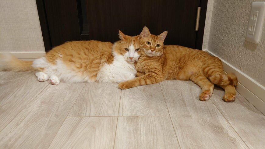 「ここは通さないニャ……」なんて声が聞こえてきそうな表情も、また可愛らしいポイントです。猫コンビのまさかの行動に、思わず心が温まるワンショットでした。