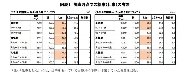 この資料によれば、60歳代で収入を伴いながら働いている人の割合は59%となっています。