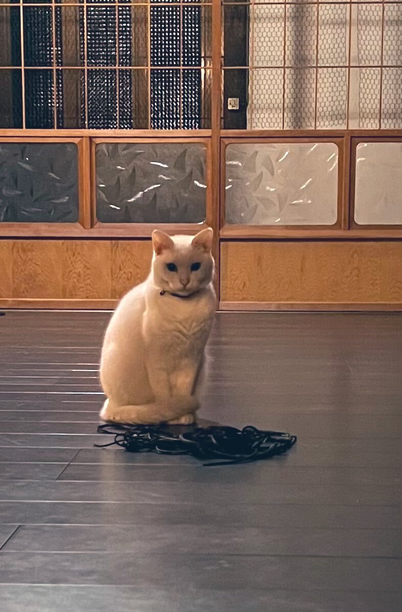 お行儀よく座ってこちらを見ていますが……猫ちゃんの前にあるのは「網戸のゴム」だそう。
