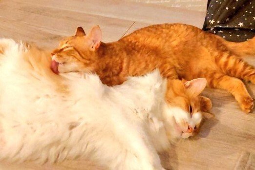 もう1匹の猫ちゃんの、優しく毛づくろいしてあげる姿にも癒されてしまいます。
