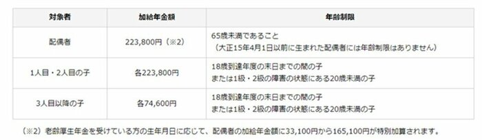 なお、加給年金は「厚生年金」について適用されるものなので、会社員や公務員などの第2号被保険者しか受け取ることができず、自営業者など厚生年金に入っていない場合は対象外となります。