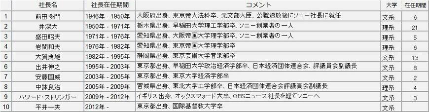 また、1946年創業で今年71年目を迎えるソニーには10人の社長経験者がいますが、下表のように最終学歴が文系の社長は6人、理系が4人となっています。ソニーというとハイテク企業であるため理系出身者中心のイメージですが、実際には文系社長も意外に多かったということです。