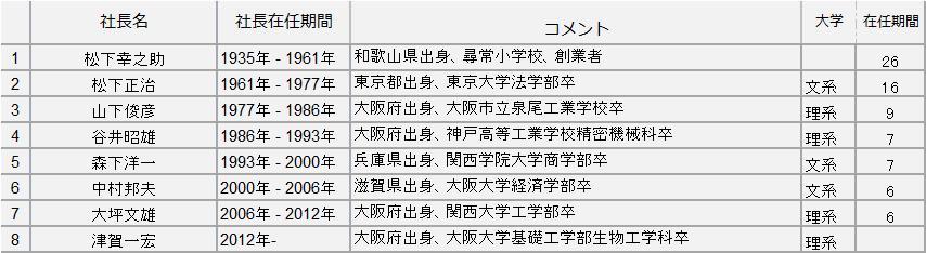ソニーの社長の経歴を振り返ったついでに、パナソニック(6752)がどうであったかも見ておきましょう。下表にあるようにパナソニックには1935年の創業以来、8人の社長経験者がいますが、このうち理系出身者は4人です。