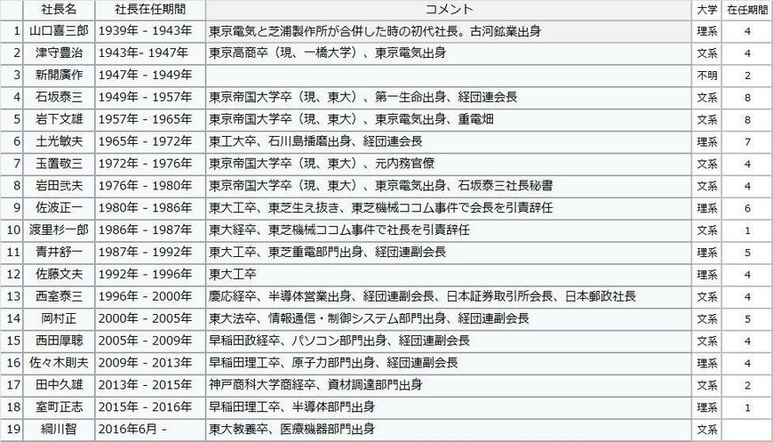 また、粉飾決算問題で辞任した西田厚聰氏、田中久雄氏も文系社長であり、現在の社長の綱川智氏も同様です。