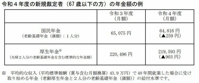 こちらによると、厚生年金のモデル夫婦(平均標準報酬(賞与含む月額換算)43.9万円)で40年間就業した場合に受け取り始める年金(老齢厚生年金と2人分の老齢基礎年金(満額))の令和4年度の受給額は、「21万9593円」です。