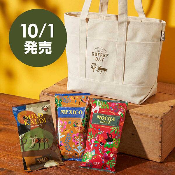 数量限定のコーヒー豆3種とシンプルデザインで普段使いもしやすいバッグのセット。2022年10月1日(土)10時より、カルディコーヒーファーム店舗および公式オンラインストア発売しています。