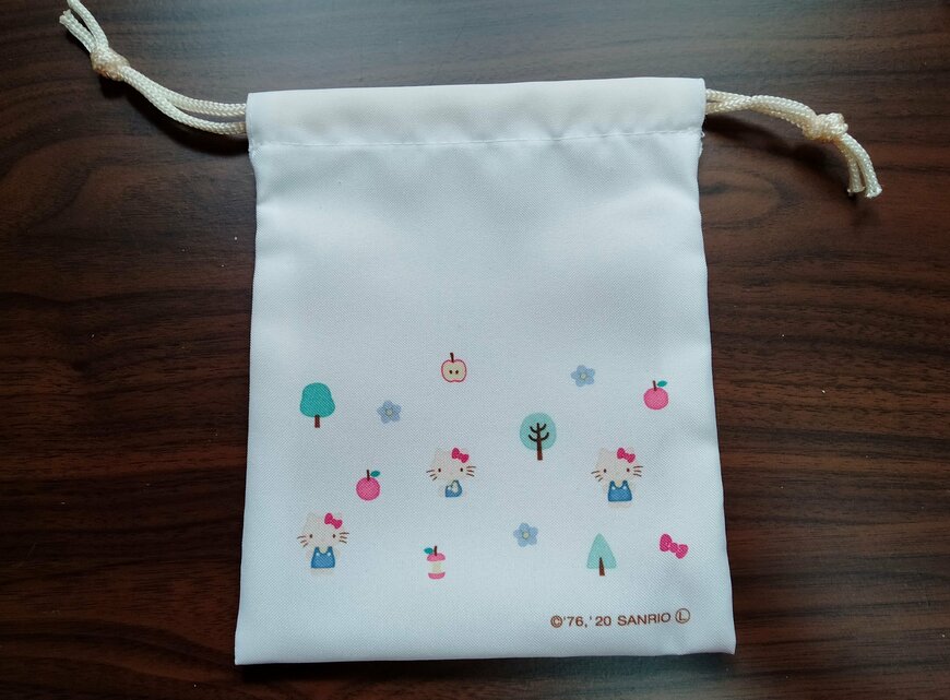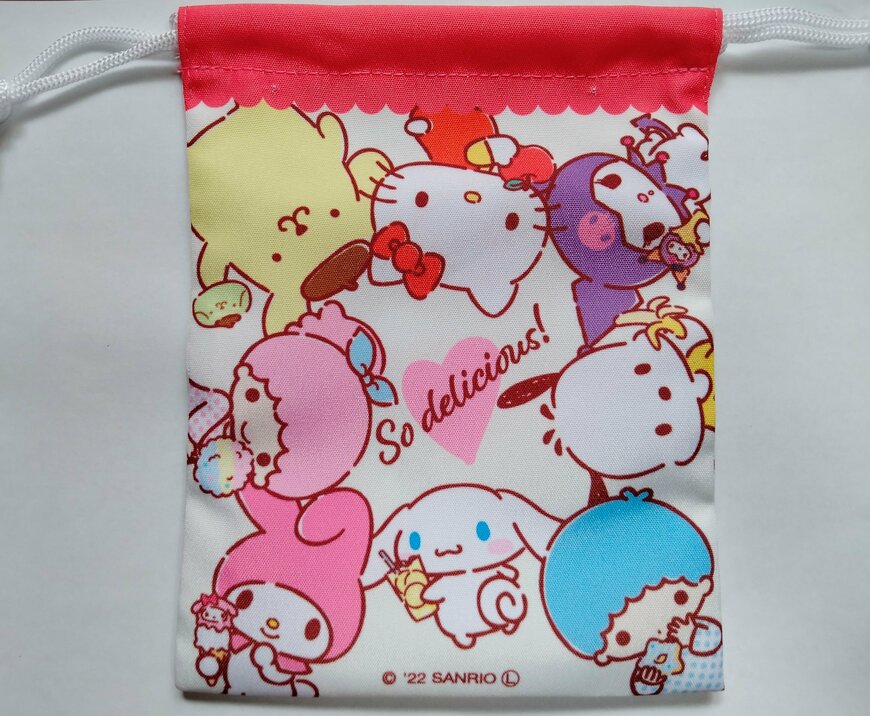 まずはこちら。サンリオキャラが勢ぞろいしている巾着です。それぞれお気に入りのお菓子を手に持っています。