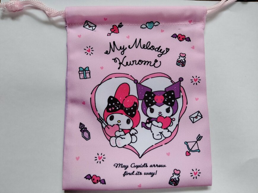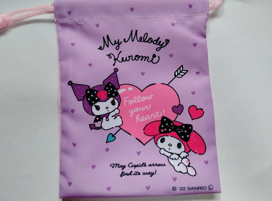 次はこちらの『おねがいマイメロディ』デザインのポーチです。ハートを抱えたマイメロディとクロミが描かれています。