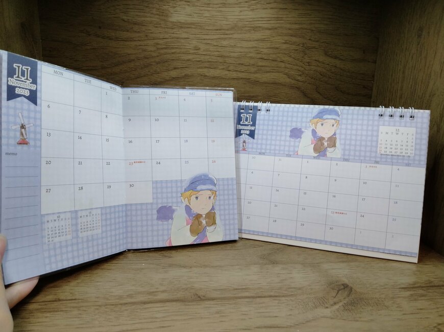 写真のように、手帳とカレンダーはイラストが共通しています。同じ作品で手帳とカレンダーを合わせて使えば、月を間違えにくくなるので便利でしょう。