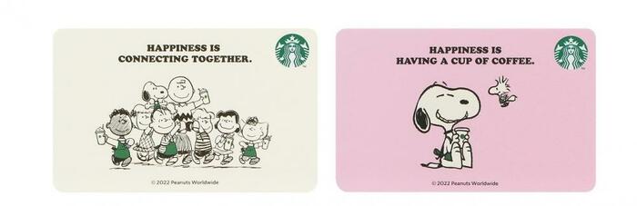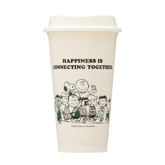 表面には、サイレンロゴと、STARBUCKS PEANUTSのタグラインが入っています。裏面には、”HAPPINESS IS CONNECTING TOGETHER”のメッセージと共に、グリーンエプロンを着たスヌーピーや、その仲間たちが一緒になって歩んでいく様子が描かれています。