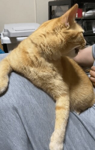 リラックスしているようで、膝の上で毛づくろいを始めた猫ちゃんでしたが……?