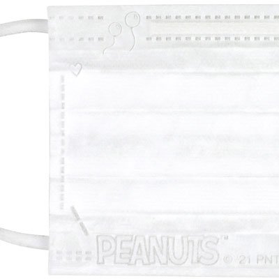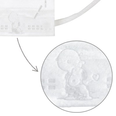 「スヌーピー 30枚入り BOXマスク (ハグ)」は、不織布マスクが30枚入ったBOXです。スヌーピーとチャーリー・ブラウンがギュッと抱き合っている様子が、箱に描かれるとともに、不織布マスクの表面にも型押しされています。3層式で、花粉・ウイルス飛沫・PM2.5対策に役立つ点は通常のマスクと同様です。