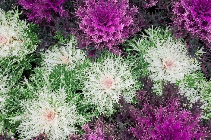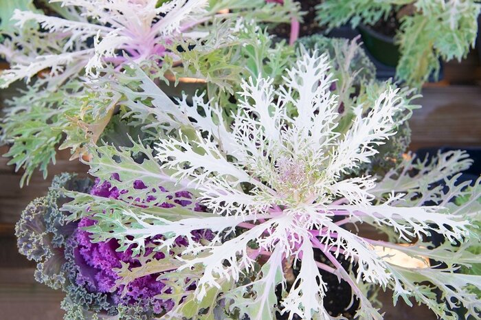 別名「サンゴ系」とも呼ばれる切葉系はレースのような美しい切り込みが特徴のハボタン。ホワイトの切葉系ハボタンは雪の結晶のようにも見え、冬の寄せ植えにも取り入れやすいでしょう。