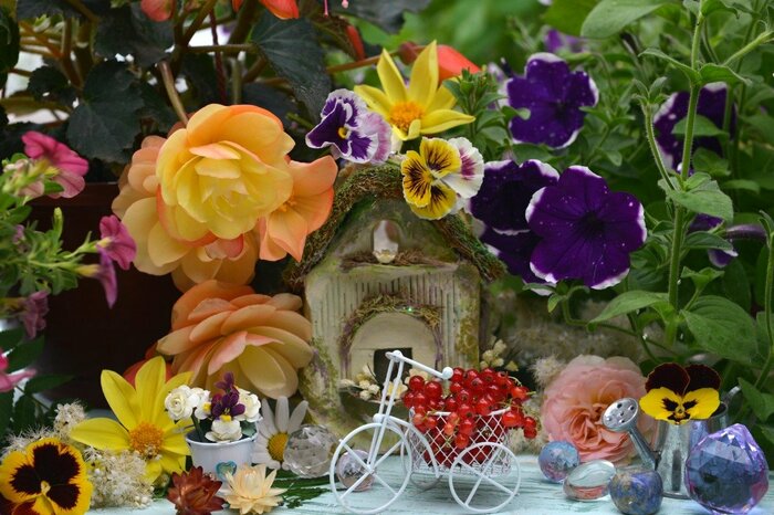 鉢やガーデン雑貨、フェンスなどをレイアウトして高低差を出すのもオススメです。
