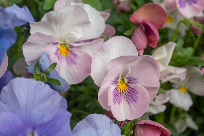 ビタミンカラーやパステルカラー、単色や複色など多彩な花色が揃うパンジー。