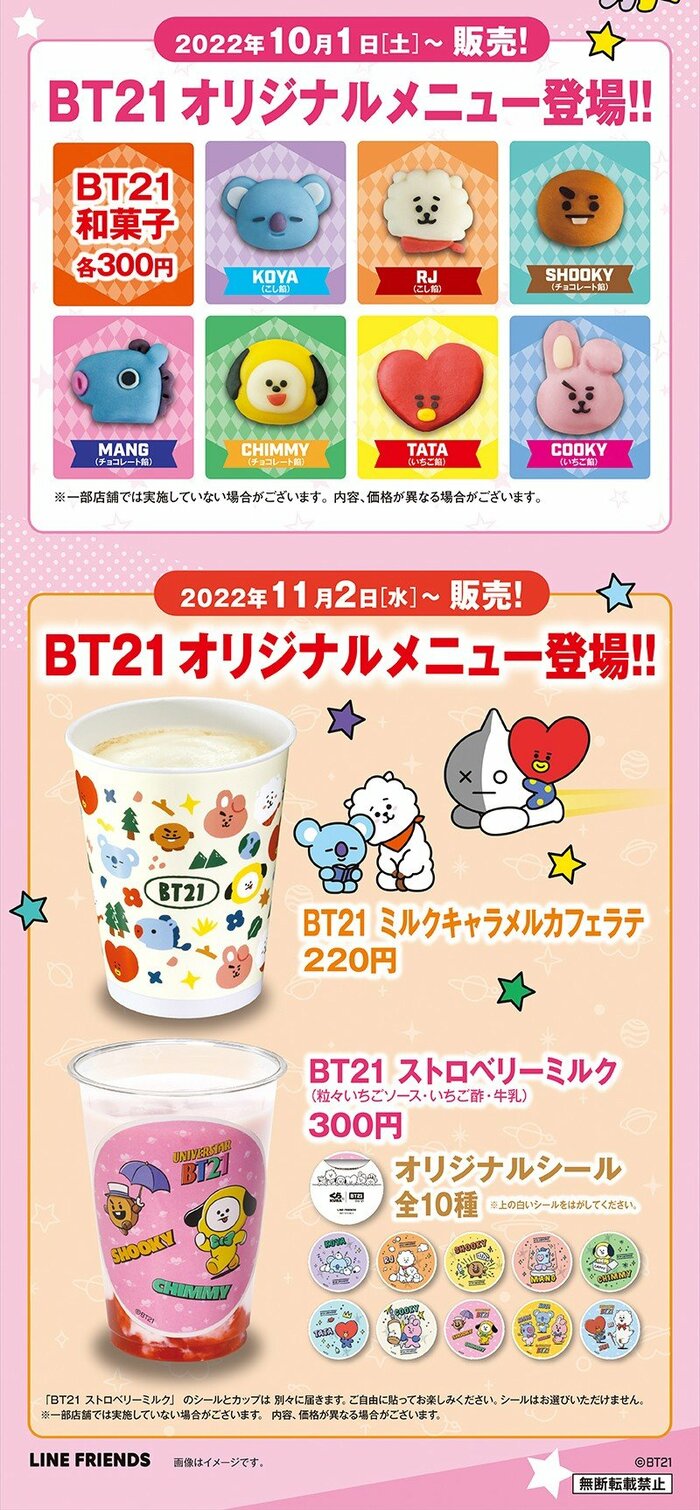 くら寿司が2022年1月に行った「BT21」との初タイアップキャンペーンでは、SNSを中心に話題となりました。第2弾となる今回のタイアップキャンペーンでは、「BT21」の各キャラクターをモチーフにした和菓子や、全10種ある完全オリジナルデザインのシールが付いた「BT21 ストロベリーミルク」など、タイアップメニューが登場します。