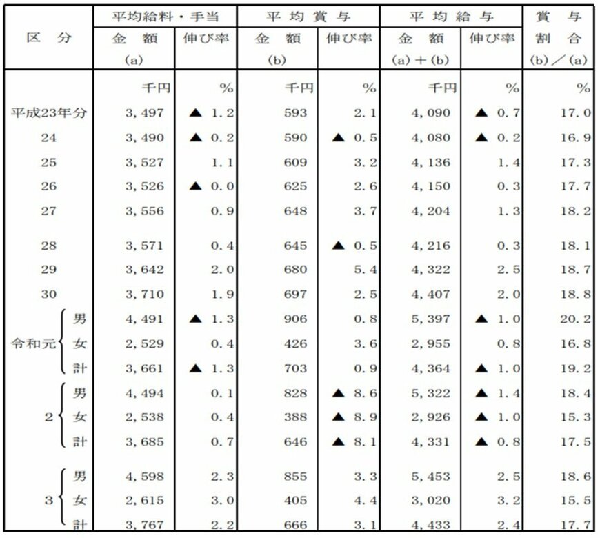 また、平均給料・手当に対する平均賞与の割合(賞与割合)は17.7%(男性18.6%、女性15.5%)となっています。